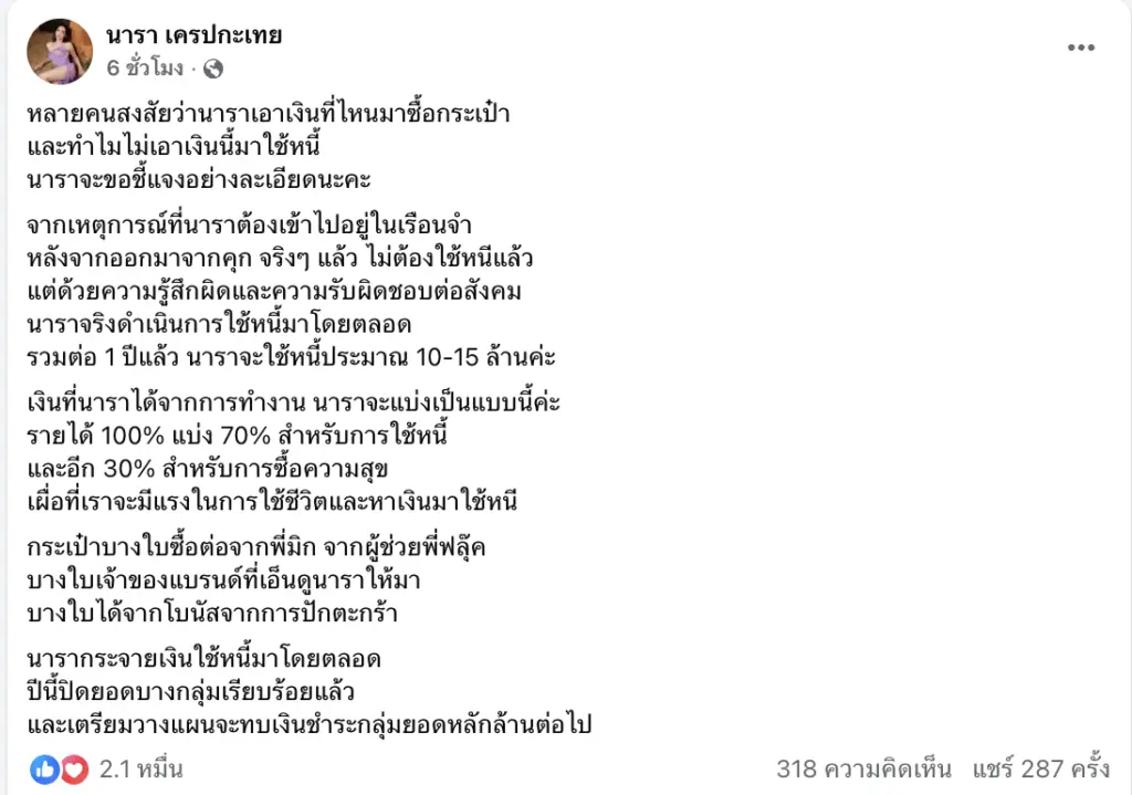 “นารา เครปกระเทย” เปิดใจชัด หลังถูกถามแรง เอาเงินที่ไหนซื้อกระเป๋า ทำไมไม่เอาไปใช้หนี้