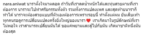 โดย นารา ได้โพสต์ภาพบนเครื่องบิน พร้อมแคปชั่นที่บอกว่า นาราตั้งใจมาตลอด ถ้าวันที่เราลดน้ำหนักได้และหุ่นสวยตามที่เราต้องการ นาราจะไปทำศรัยกรรมทั้งตัว รวมทั้งการแปลงเพศ และสุดท้ายนาราก็ทำได้ นาราจะต้องสวยแบบที่ตัวเองต้องการเพราะรอบนี้ ทำตั้งแต่ผม ยันเล็บเท้า ทุกคนรอดูการเปลี่ยนแปลงครั้งยิ่งใหญ่ของนารา❤️ เราเกิดมาในรูปลักษณ์ที่เราไม่พอใจ เราสามารถเปลี่ยนมันได้ ขอแค่พยามและสู้ไปกับมัน เกิดมาชาติหนึ่งมันต้องสุด
