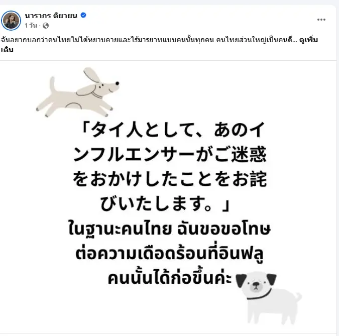 “ฉันอยากบอกว่าคนไทยไม่ได้หยาบคายและไร้มารยาทแบบคนนั้นทุกคน คนไทยส่วนใหญ่เป็นคนดี (I want to say that not all Thai people are rude and impolite like that person. Most Thai people are kind and well-mannered.)”