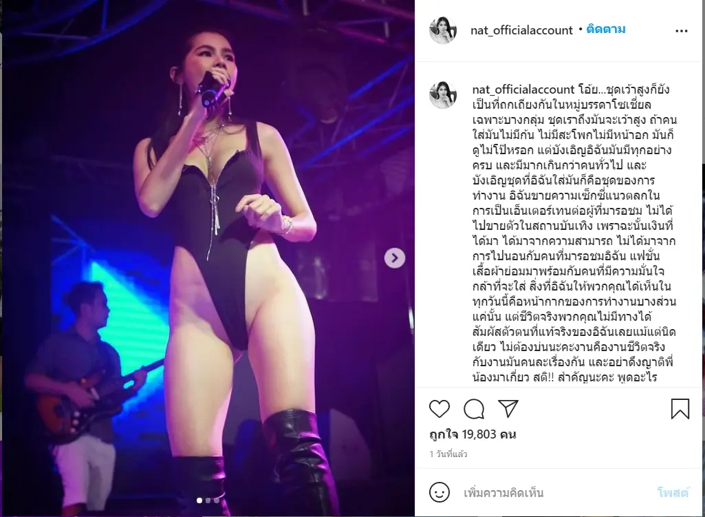 “โอ้ย…ชุดเว้าสูงก็ยังเป็นที่ถกเถียงกันในหมู่บรรดาโซเชี่ยลเฉพาะบางกลุ่ม ชุดเราถึงมันจะเว้าสูง ถ้าคนใส่มันไม่มีก้น ไม่มีสะโพก ไม่มีหน้าอก มันก็ดูไม่โป๊หรอก แต่บังเอิญอิฉันมันมีทุกอย่างครบ และมีมากเกินกว่าคนทั่วไป และบังเอิญชุดที่อิฉันใส่มันก็คือชุดของการทำงาน อิฉันขายความเซ็กซี่แนวตลกในการเป็นเอ็นเตอร์เทนต่อผู้ที่มารอชม ไม่ได้ไปขายตัวในสถานบันเทิง เพราฉะนั้นเงินที่ได้มา ได้มาจากความสามารถ ไม่ได้มาจากการไปนอนกับคนที่มารอชมอิฉัน แฟชั่นเสื้อผ้าย่อมมาพร้อมกับคนที่มีความมั่นใจกล้าที่จะใส่ สิ่งที่อิฉันให้พวกคุณได้เห็นในทุกวันนี้คือหน้ากากของการทำงานบางส่วนแค่นั้น แต่ชีวิตจริงพวกคุณไม่มีทางได้สัมผัสตัวตนที่แท้จริงของอิฉันเลยแม้แต่นิดเดียว ไม่ต้องบ่นนะคะงานคืองานชีวิตจริงกับงานมันคนละเรื่องกัน และอย่าดึงญาติพี่น้องมาเกี่ยว สติ!! สำคัญนะคะ พูดอะไรเกี่ยวกับใครดูที่ตัวบุคคลของคนๆนั้น ไม่ใช่ไปดึง2-3-4มาพูดมาวิจารณ์ แบบนั่นเรียกขาดสติ และ มารยาทค่ะ… #ชุดเว้าสูงมาเดี๋ยวก็ไปเปลี่ยนไปตามเทรน #อิฉันเป็นผู้นำทางด้านความแปลกที่แตกต่าง”