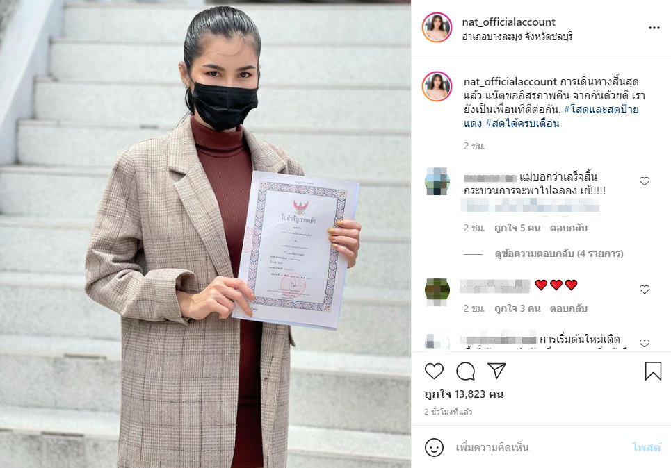 โดยเมื่อวันที่ 24 พ.ค. 2564 ทางสาวแนท ก็ได้โพสต์ภาพตนเองคู่ใบหย่าลงอินสตาแกรมส่วนตัว พร้อมบอกข่าวกับทุกคน ว่า