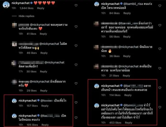 จากที่ก่อนหน้านี้ นิกกี้ ณฉัตร เข้ามาคอมเมนต์ส่งหัวใจให้แม่คิ้มรัวๆในโพสต์ที่โดนดราม่า ก่อนที่เจ้าตัวจะโดนดราม่าเอง ซึ่งทำเอาชาวเน็ตเข้ามาคอมเมนต์แซะนิกกี้ว่าสลิ่ม พร้อมยังประกาศจะเลิกติดตามเลิกดู และยังลามไปถึง ก้อย (อรัชพร) แฟนสาวนิกกี้ ถึงเหตุการณ์นี้อีกด้วย
