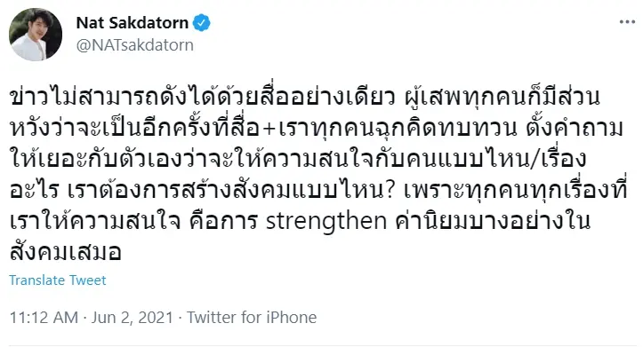 “ข่าวไม่สามารถดังได้ด้วยสื่ออย่างเดียว ผู้เสพทุกคนก็มีส่วน หวังว่าจะเป็นอีกครั้งที่สื่อ+เราทุกคนฉุกคิดทบทวน ตั้งคำถามให้เยอะกับตัวเองว่าจะให้ความสนใจกับคนแบบไหน/เรื่องอะไร เราต้องการสร้างสังคมแบบไหน? เพราะทุกคนทุกเรื่องที่เราให้ความสนใจ คือการ strengthen ค่านิยมบางอย่างในสังคมเสมอ”
