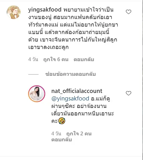 โดยล่าสุด อ.ยิ่งศักดิ์ ได้ถือโอกาสเข้าไปคอมเมนต์เตือนด้วยว่า “พยายามเข้าใจว่าเป็นงานของนู๋ สอนมากแฟนคลับก้อเอาทัวร์มาลงแม่ แต่แม่ไม่อยากให้นู๋ยกขาแบบนี้ แล้วตากล้องก้อมาถ่ายมุมนี้ด้วย เขาจะจินตนาการไปกันใหญ่สิลูก เอาขาลงเถอะลูก” ด้านสาวแนทเองก็ได้เข้ามาตอบตอมเมนต์ของอาจาร์ยิ่งศักดิ์ “อ.แม่ก็ดูผ่านๆซิคะ อย่าจ้องนาน เดี๋ยวมันออกมาหนีบเอานะคะ”