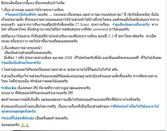 สำหรับประเด็น หัตถการหรือการทำหัตถการบนใบหน้า เจ้าตัวยืนยันว่าเป็นเงินส่วนตัวทั้งหมด มีเพียงครั้งเดียวในช่วงเดือนตุลาคม 2568 ที่ไปพร้อมบุคคลอื่น ซึ่งไม่ใช่เงินของตนเอง และย้ำจุดยืนเดิมอย่างชัดเจนอีกครั้ง