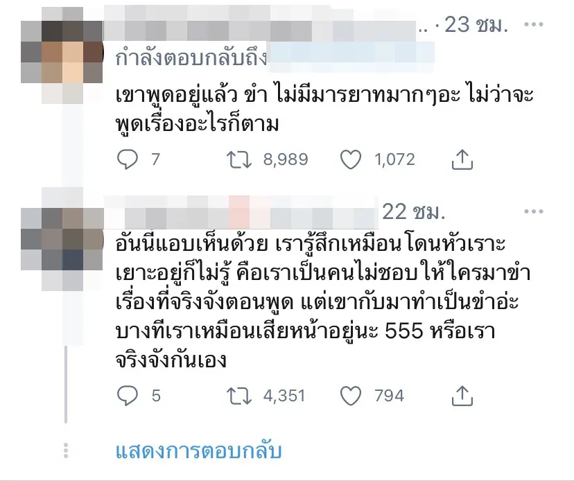 ทั้งนี้ในขณะที่ป้องพูดขึ้นมานั้น ใหม่และตงตง ได้พยายามหลบออกจากกล้องออกไป ซึ่งทำให้มีชาวเน็ตหลายคนออกมาติงถึงเรื่องดังกล่าวว่ามีพฤติกรรมที่ไม่เหมาะสม ทั้งเรื่องที่หลบตัวออกจากกล้อง หรือแม้แต่ขำในช่วงที่ป้องได้อธิบายในความคิดเห็นส่วนตัวออกไป