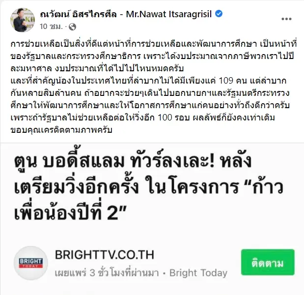 ณวัฒน์ อิสรไกรศีล ออกมาร่ายโพสต์ยาวถึง ตูน บอดี้สแลม หลังประกาศจัดทำโครงการ “ก้าวเพื่อน้องปีที่ 2” เพื่อหาทุนการศึกษาในเด็กด้อยโอกาส 109 คน