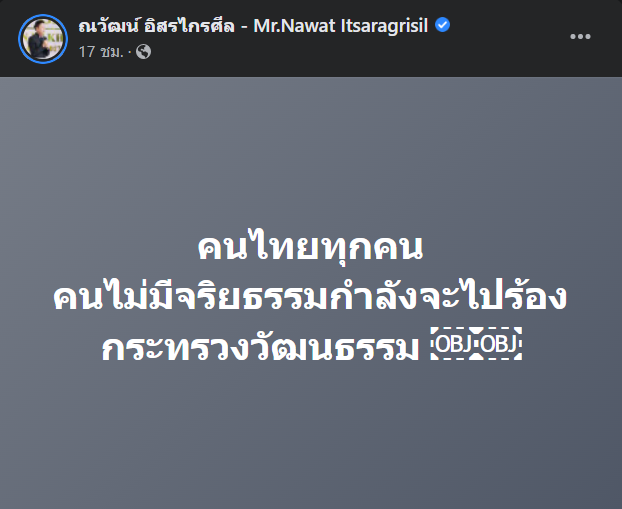 ทว่าล่าสุด (19 เม.ย. 65) บอสณวัฒน์ ก็ได้โพสต์ข้อความปริศนาบางอย่างผ่านทางเพจ ณวัฒน์ อิสรไกรศีล – Mr.Nawat Itsaragrisil ระบุว่า ‘คนไทยทุกคน คนไม่มีจริยธรรมกำลังจะไปร้องกระทรวงวัฒนธรรม’ ซึ่งในโพสต์ดังกล่าวไม่ได้มีการระบุเพิ่มเติมว่าบุคคลปริศนานั้นหมายถึงใคร