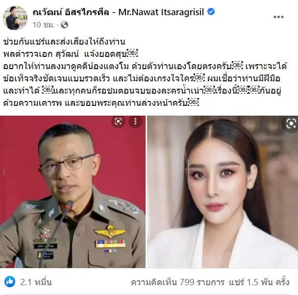 ‘ช่วยกันแชร์และส่งเสียงให้ถึงท่าน พลตำรวจเอก สุวัฒน์ แจ้งยอดสุข อยากให้ท่านลงมาดูคดีน้องแตงโมด้วยตัวท่านเองโดยตรงครับ เพราะจะได้ข้อเท็จจริงชัดเจนแบบรวดเร็ว และไม่ต้องเกรงใจใคร ผมเชื่อว่าท่านมีฝีมือและทำได้ และทุกคนก็รอชมตอนจบของละครน้ำเน่าเรื่องนี้กันอยู่ ด้วยความเคารพ และขอบพระคุณท่านล่วงหน้าครับ’