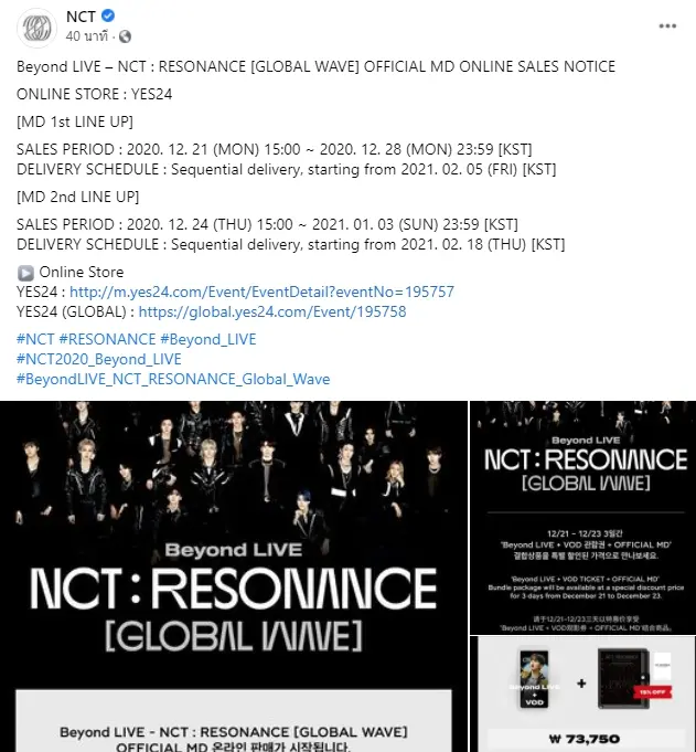 โดยล่าสุด ทางแอคเคาท์ออฟฟิเชี่ยลของ NCT ได้ออกมาโพสต์เกี่ยวกับรายละเอียดการจำหน่ายบัตรคอนเสิร์ตออนไลน์ รวมถึงของออฟฟิเชี่ยลที่กำลังจะมีขายขึ้น ว่า