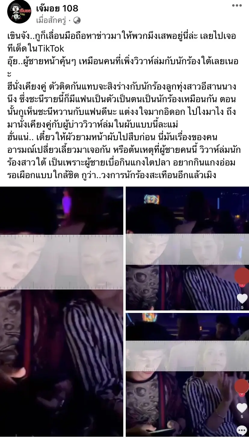 ฮั่นแน่.. เดี๋ยวให้ผัวยามหน้าผับไปสืบก่อน นี่มันเรื่องของคนอารมณ์เปลี่ยวเลี้ยวมาเจอกัน หรือต้นเหตุที่ผู้ชายคนนี้ วิวาห์ล่มนักร้องสาวใต้ เป็นเพราะผู้ชายเบื่อกินแกงไตปลา อยากกินแกงอ่อม รอเผือกแบบใกล้ชิด กูว่า..วงการนักร้องสะเทือนอีกแล้วเมิง”