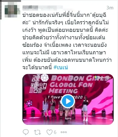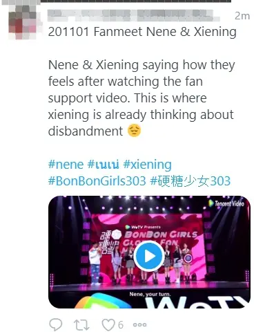 ล่าสุดสาวๆสมาชิก BonBonGirls303 ได้ไปออกรายการ BonBonGirls Global Fan Meeting ซึ่งสาวๆก็ได้มีการพูดคุยเเละโชว์พลังเสียงกันให้แฟนๆหายคิดถึง งานนี้ด้วยพลังของเนเน่ เหล่าบรรดาแฟนคลับทั้งไทยและต่างประเทศก็ต่างพากันติดเเฮชแท็ก #เนเน่ ส่งกำลังใจให้รวมถึงพูดคุยเเละแชร์โมเมนต์ต่างๆในรายการ เรียกได้ว่าการออกรายการในครั้งนี้ ทำให้แฟนๆหายคิดถึงจริงๆค่า