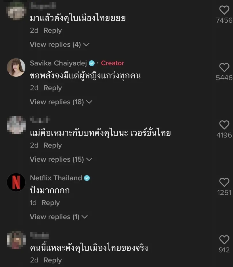 ล่าสุด TikTok – Netflix Thailand ได้มีการคอมเมนต์ใต้คลิปของ พิ้งกี้ สาวิกา ว่า ปังมากกกก อีกทั้งบรรดาแฟนๆยังมีการชื่นชมความสวย เป๊ะ ปัง ของเธอเป็นจำนวนมากอีกด้วย