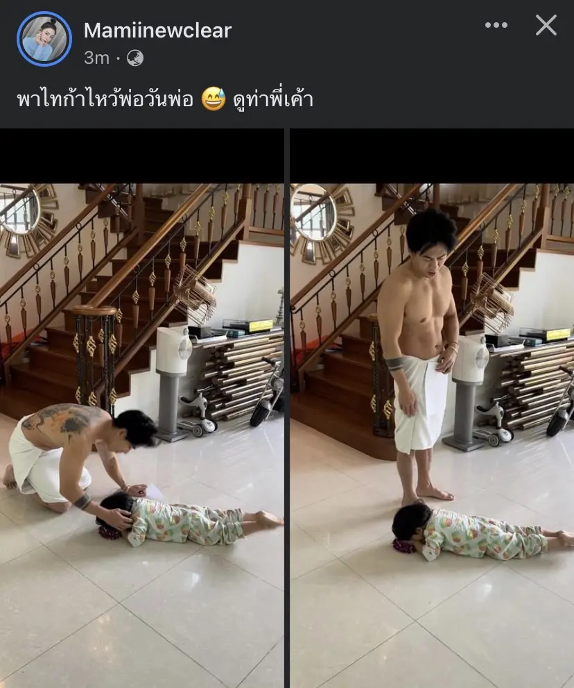 บอกเลยว่า น้องไทก้า พกความน่ารัก น่าเอ็นดูมาเต็ม เพราะดูจากท่า โอ้โฮ ถึงขั้นหมอบกราบ ดีเจเพชรจ้า เลยทีเดียว นอกจากนี้ด้านอินสตาแกรม ดีเจเพชรจ้า ก็ได้มีการโพสต์คลิปที่ นิวเคลียร์ เป็นคนถ่าย พร้อมระบุแคปชั่นว่า กราบเท้าวันพ่อ พ่อพึ่งตื่น จุ่โจม กัน มาทั้งแม่ทั้งลูก มีความสุขมากๆในวันพ่อนะครับ