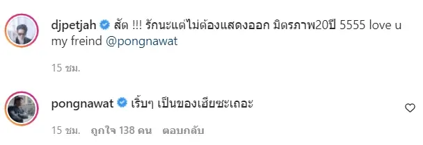 ล่าสุด ดีเจเพชรจ้า ได้มีการโพสต์ภาพคู่กับพระเอกหนุ่มคนสนิท อย่าง ป้อง ณวัฒน์ พร้อมข้อความว่า สัด !!! รักนะแต่ไม่ต้องแสดงออก มิตรภาพ 20 ปี 5555 love u my freind @pongnawat ซึ่งด้าน ป้อง ณวัฒน์ ก็ได้มีการเข้าไปตอบกลับว่า เริ้บๆ เป็นของเฮียซะเถอะ