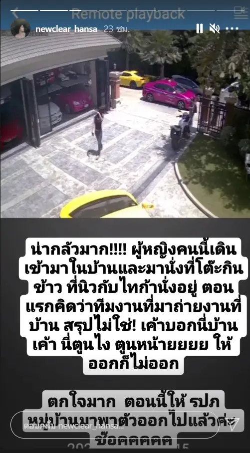 เนื่องจากวันนี้มีทีมงานมาที่บ้าน เราจึงเปิดรั้วเอาไว้ เพราะมีรถทีมงานเข้าออกตลอด (ปกติเราจะปิดรั้วบ้านเอาไว้) แต่แล้วก็ผู้หญิงคนนี้ก็เข้ามาในบ้าน ใช่ค่ะมานั่งในบ้านเลย นิวก็คิดว่าเป็น 1 ในทีมงานมาหลบแดด เพราะถ่ายกันด้านนอก แต่ก่อนที่จะนั่ง นางมีท่าทีมองหาอะไรบางอย่าง นิวก็คิดอีกว่า อ่อมาดูโลเคชั่นที่จะถ่ายในบ้าน นิวก็ยังหันไปยกมือสวัสดีค่ะเค้าเลย -.-