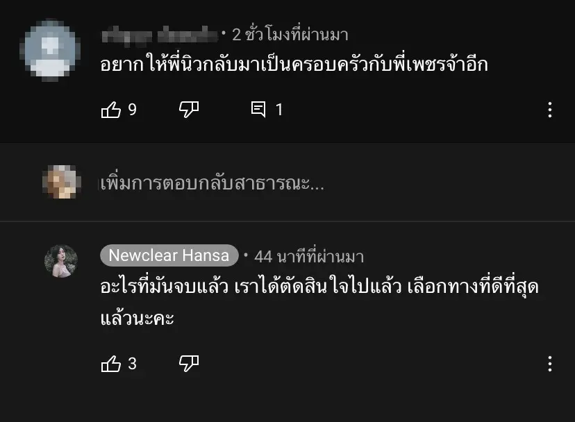 ล่าสุด นิวเคลียร์ ได้มีการอัปเดทคอนเทนต์ใหม่ในช่องยูทูปชาแนลของตัวเอง แต่ก็ดันมีชาวเน็ตเข้ามาคอมเมนต์ใต้คลิปว่า อยากให้พี่นิวกลับมาเป็นครอบครัวกับพี่เพชรจ้าอีก ซึ่ง นิวเคลียร์ ก็ไม่ได้นิ่งเฉยแต่อย่างใด เข้ามาตอบกลับว่า อะไรที่มันจบแล้ว เราได้ตัดสินใจไปแล้ว เลือกทางที่ดีที่สุดแล้วนะคะ