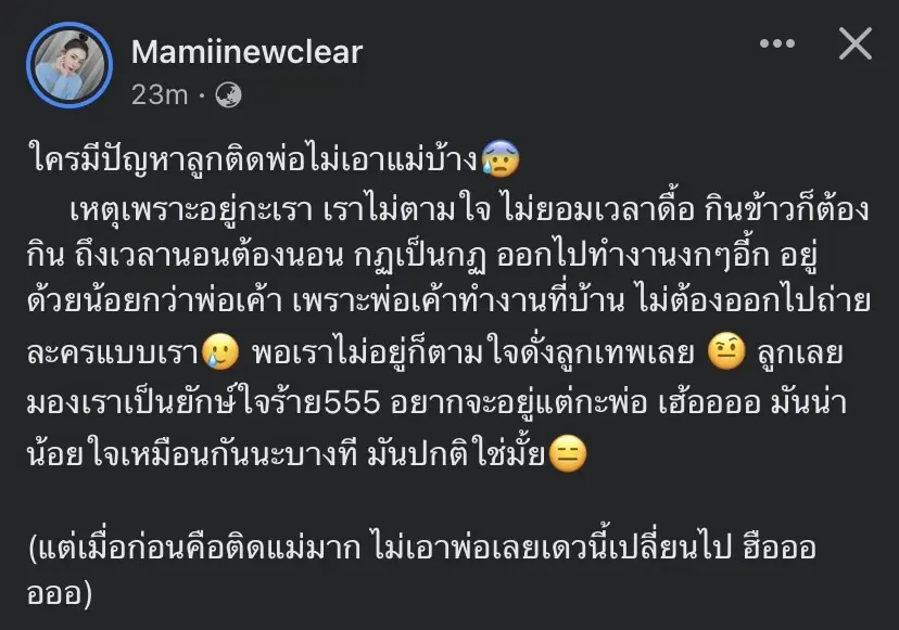 ล่าสุด เธอมีการโพสต์ข้อความที่แสดงความรู้สึกน้อยใจว่า ใครมีปัญหาลูกติดพ่อไม่เอาแม่บ้าง เหตุเพราะอยู่กะเรา เราไม่ตามใจ ไม่ยอมเวลาดื้อ กินข้าวก็ต้องกิน ถึงเวลานอนต้องนอน กฏเป็นกฏ ออกไปทำงานงกๆอี้ก อยู่ด้วยน้อยกว่าพ่อเค้า เพราะพ่อเค้าทำงานที่บ้าน ไม่ต้องออกไปถ่ายละครแบบเรา พอเราไม่อยู่ก็ตามใจดั่งลูกเทพเลย ลูกเลยมองเราเป็นยักษ์ใจร้าย555 อยากจะอยู่แต่กะพ่อ เฮ้ออออ มันน่าน้อยใจเหมือนกันนะบางที มันปกติใช่มั้ย (แต่เมื่อก่อนคือติดแม่มาก ไม่เอาพ่อเลยเดี๋ยวนี้เปลี่ยนไป ฮืออออออ) ทำเอาบรรดาแฟนๆต่างส่งกำลังใจให้เธอกันอย่างมากมาย