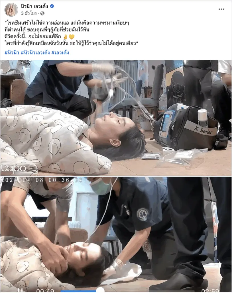 “โรคซึมเศร้าไม่ใช่ความอ่อนแอ แต่มันคือความทรมานเงียบ ๆ ที่ฆ่าคนได้ ขอบคุณพี่ ๆ กู้ภัยที่ช่วยฉันไว้ทัน ชีวิตครั้งนี้…จะไม่ยอมแพ้อีก”