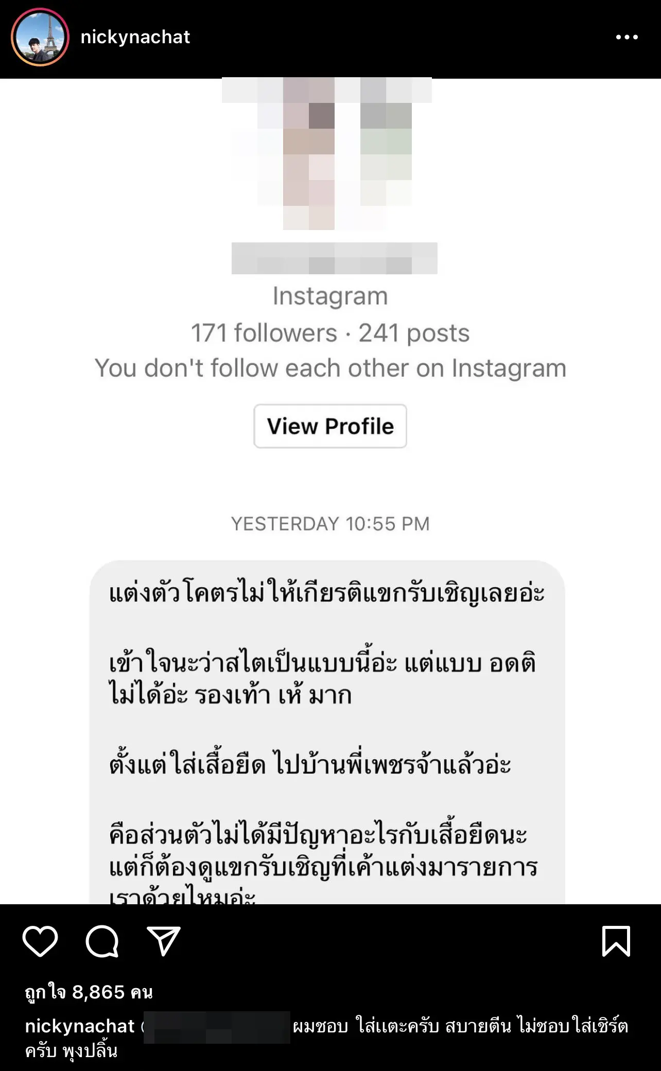 จากนั้นนิกกี้ก็ได้ตอบกลับไปว่า ผมชอบ ใส่แตะครับ สบายตีน ไม่ชอบใส่เชิร์ต พร้อมกับแท็กชื่อไอจีสาวรายดังกล่าวที่ทักแชทมาด่า ก่อนที่เจ้าตัวจะลบโพสต์ดังกล่าวทั้งหมดทิ้งไป
