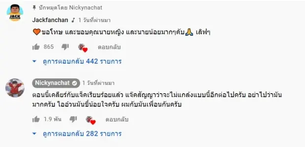 ส่วนใต้คลิปในช่องยูทูป นิกกี้ ก็ได้ชี้แจงว่า ตอนนี้เคลียร์กับแจ็คเรียบร้อยแล้ว แจ๊คสัญญาว่าจะไม่แกล้งแบบนี้อีกต่อไปครับ อย่าไปว่ามันมากครับ ไออ้วนมันขี้น้อยใจครับ ผมกับมันเพื่อนกันครับ ในขณะที่ทางด้าน แจ็ค แฟนฉัน ก็บอกว่า ขอโทษ และขอบคุณนายหญิง และนายน้อยมากๆคับ เลิฟๆ