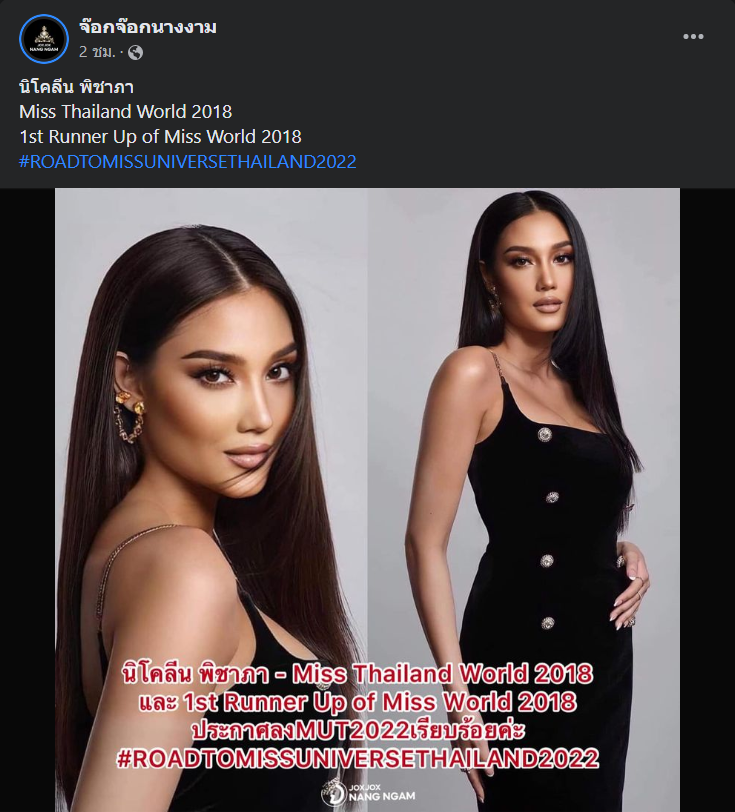 โดยเพจ จ๊อกจ๊อกนางงาม ได้ระบุข่าวดีดังกล่าวว่า “นิโคลีน พิชาภา มิสไทยแลนด์เวิลด์ 2018 และ รองอันดับ 1 มิสเวิลด์ 2018 ประกาศลง MUT 2022 เรียบร้อยค่ะ” กลายเป็นตัวเต็งที่น่าจับตามองในปีนี้ไปโดยปริยาย ด้วยเอเชียนลุค และปฏิภาณไหวพริบที่เคยโชว์ศักยภาพบนเวทีโลกมาแล้วว่า เธอไม่เคยตายไมค์