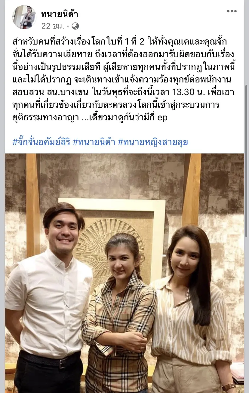 ล่าสุด ทนายนิด้า ได้มีการโพสต์ภาพคู่กับจั๊กจั่นและคุณเค (สามีของจั๊กจั่น) พร้อมข้อความผ่านเฟซบุ๊ก ทนายนิด้า ว่า “สำหรับคนที่สร้างเรื่องโลกใบที่ 1 ที่ 2 ให้ทั้งคุณเคและคุณจั๊กจั่นได้รับความเสียหาย ถึงเวลาที่ต้องออกมารับผิดชอบกับเรื่องนี้อย่างเป็นรูปธรรมเสียที ผู้เสียหายทุกคนทั้งที่ปรากฎในภาพนี้และไม่ได้ปรากฏ จะเดินทางเข้าแจ้งความร้องทุกข์ต่อพนักงานสอบสวน สน.บางเขน ในวันพุธที่จะถึงนี้เวลา 13.30 น. เพื่อเอาทุกคนที่เกี่ยวข้องเกี่ยวกับละครลวงโลกนี้เข้าสู่กระบวนการยุติธรรมทางอาญา …เดี๋ยวมาดูกันว่ามีกี่ ep #จั๊กจั่นอคัมย์สิริ #ทนายนิด้า #ทนายหญิงสายลุย”