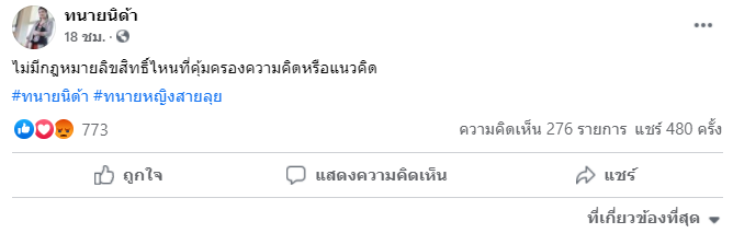 ดังกล่าว ทนายนิด้าได้ออกมาโพสต์เฟซบุ๊คแสดงจุดยืนของตนเองอีกครั้ง “ไม่มีกฎหมายลิขสิทธิ์ไหนที่คุ้มครองความคิดหรือแนวคิด #ทนายนิด้า #ทนายหญิงสายลุย”