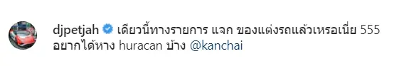 ขณะเดียวกับ ดีเพชรจ้า ก็ได้เข้ามาคอมเมนต์แซวพร้อมแท็กไอจีหนุ่มกรรชัยอีกว่า เดียวนี้ทางรายการ แจก ของแต่งรถแล้วเหรอเนี่ย 555 อยากได้หาง huracan บ้าง