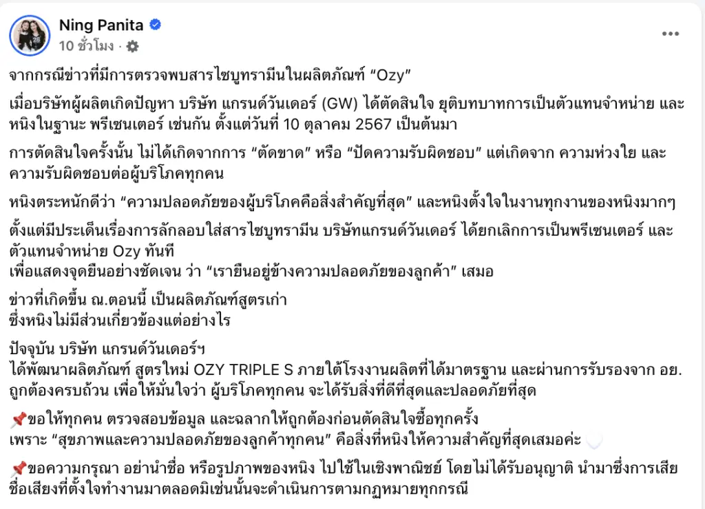 ทางด้าน บริษัท แกรนด์วันเดอร์ จำกัด ซึ่งเป็นตัวแทนจำหน่ายของผลิตภัณฑ์ดังกล่าว ได้ออก จดหมายชี้แจงอย่างเป็นทางการ ว่า ได้ยุติบทบาทการเป็นตัวแทนจำหน่ายผลิตภัณฑ์ Ozy ตั้งแต่วันที่ 10 ตุลาคม 2567 พร้อมยืนยันว่า บริษัทและคุณหนิง ปณิตา ไม่มีส่วนเกี่ยวข้องกับผลิตภัณฑ์สูตรเก่าที่กำลังเป็นข่าวในขณะนี้แต่อย่างใด