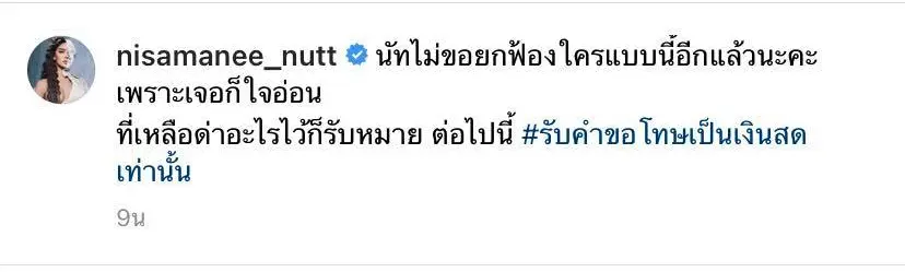 นัท นิสามณี ถอดฟ้องคู่กรณีคู่หนึ่งที่ถูกเจ้าตัวฟ้องจากการคอมเม้นท์ต่อว่าตนเองในเฟสบุ้ค ย้ำว่านี่จะเป็นครั้งสุดท้าย หลังจากนี้จะไม่ใจอ่อน ที่เหลือด่าอะไรไว้ก็รอรับหมาย รับคำขอโทษเป็นเงินสดเท่านั้น
