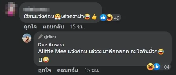 ซึ่งงานนี้ก็ได้มีแฟนคลับเข้ามาคอมเมนต์แซวแบบขำๆว่า เรียนแจ้งก่อนเดี๋ยวดราม่า งานนี้ ดิว อริสรา ก็ได้มีการเข้ามาตอบทันทีว่า แจ้งก่อน เดี๋ยวจะมาลือออออ อะไรกันมั่วๆ