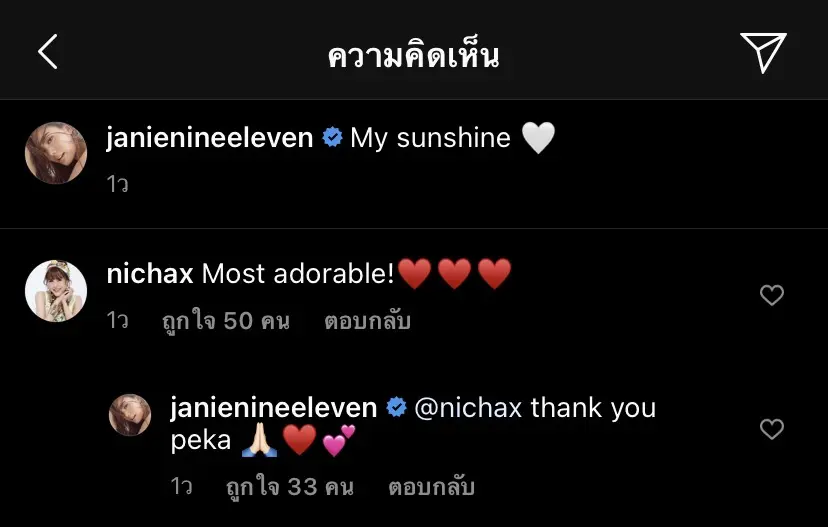 ซึ่งมักจะมีแฟนๆ และเพื่อนๆร่วมวงการเข้าไปคอมเมนต์ชื่นชมในความน่ารัก น่าเอ็นดูของน้องโนล่ากันเป็นจำนวนมาก แต่ครั้งนี้ทำเอาเจนี่ถึงกับปลื้มปริ่มเลยทีเดียว เมื่อ ทูลกระหม่อมหญิงอุบลรัตนราชกัญญา สิริวัฒนาพรรณวดี ได้เข้าไปคอมเมนต์ใต้ภาพน้องโนล่าว่า “Most adorable” พร้อมอิโมจิรูปหัวใจ ซึ่งแปลได้ว่า “น่ารักที่สุด ซึ่งเจนี่ก็ได้ตอบพระองค์ท่านว่า “thank you peka” พร้อมอิโมจิรูป พนมมือ และ หัวใจ