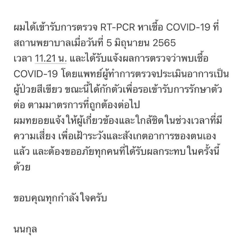 🙏🏻eng: COVID-19 detected. ปิดฉากวันสุดท้ายของอายุ 25 อย่างสวยงามครับ What a wonderful last day of my 25 years old ผมได้เข้ารับการตรวจ RT-PCR หาเชื้อ COVID-19 ที่สถานพยาบาลเมื่อวันที่ 5 มิถุนายน 2565 เวลา 11.21 น. และได้รับแจ้งผลการตรวจว่าพบเชื้อ COVID-19 โดยแพทย์ผู้ทำการตรวจประเมินอาการเป็นผู้ป่วยสีเขียว ขณะนี้ได้กักตัวเพื่อรอเข้ารับการรักษาตัวต่อ ตามมาตรการที่ถูกต้องต่อไป ผมทยอยแจ้งให้ผู้เกี่ยวข้องและใกล้ชิด ในช่วงเวลาที่มีความเสี่ยง เพื่อเฝ้าระวังและสังเกตอาการของตนเองแล้ว และต้องขออภัยทุกคนที่ได้รับผลกระทบ ในครั้งนี้ด้วย ขอบคุณทุกกำลังใจครับ นนกุล