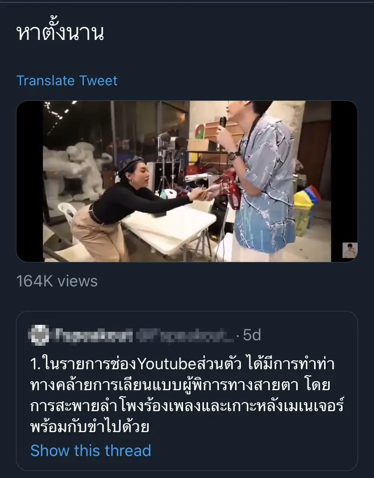 โดยได้มีผู้ใช้ทวิตเตอร์รายหนึ่งได้ออกมาขุดถึงพฤติกรรมของนนท์ในคลิปที่เคยลงในช่องยูทูปของตัวเอง โดยในคลิปนั้นเป็นคลิปที่นนท์ทำท่าทางเลียนแบบผู้พิการทางสายตาโดยการสะพายลำโพงไว้ด้านหน้า เดินตามหลังผู้จัดการพร้อมกับร้องเพลงไปด้วย ซึ่งเมื่อคนได้เห็นคลิปนี้ก็ต่างออกมาติงนักร้องหนุ่มกันยกใหญ่ว่า การกระทำนี้ไม่เหมาะสม และไม่ควรนำปมด้อยของผู้อื่นทำล้อเลียนเป็นเรื่องตลกเช่นนี้