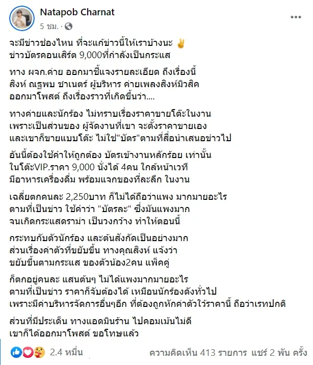 ล่าสุด ทาง ผจก.ค่าย ออกมาชี้แจงรายละเอียด ถึงเรื่องนี้ สิงห์ ณฐพบ ชาเนตร์ ผู้บริหาร ค่ายเพลงสิงห์มิวสิค ออกมาโพสต์ ถึงเรื่องราวที่เกิดขึ้นว่า “ทางค่ายและนักร้อง ไม่ทราบเรื่องราคาขายโต๊ะในงาน เพราะเป็นส่วนของ ผู้จัดงานที่เขา จะตั้งราคาขายเอง และเขาก็ขายแบบโต๊ะ ไม่ใช่”บัตร”ตามที่สื่อนำเสนอข่าวไป อันนี้ต้องใช้คำให้ถูกต้อง บัตรเข้างานหลักร้อย เท่านั้นในโต๊ะVIP.ราคา 9,000 นั่งได้ 4คน ใกล้หน้าเวที มีอาหารเครื่องดื่ม พร้อมแจกของที่ละลึก ในงานเฉลี่ยตกคนละ 2,250บาท ก็ไม่ได้ถือว่าแพง มากมายอะไรตามที่เป็นข่าว ใช้คำว่า “บัตรละ” ซึ่งมันแพงมาก จนเกิดกระแสดราม่า เป็นวงกว้าง ทำให้ตอนนี้ กระทบกับตัวนักร้อง และต้นสังกัดเป็นอย่างมาก ส่วนเรื่องค่าตัวที่ขยับขึ้น ทางคุณสิงห์ แจ้งว่า ขยับขึ้นตามกระแส ของตัวน้อง2คน แพ็คคู่ ก็ตกอยู่คนละ แสนต้นๆ ไม่ได้แพงมากมายอะไร