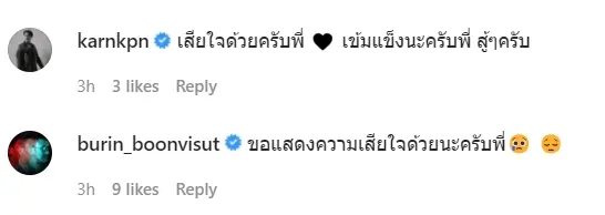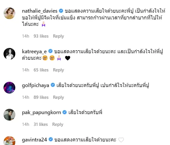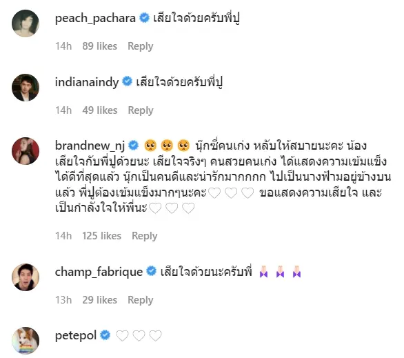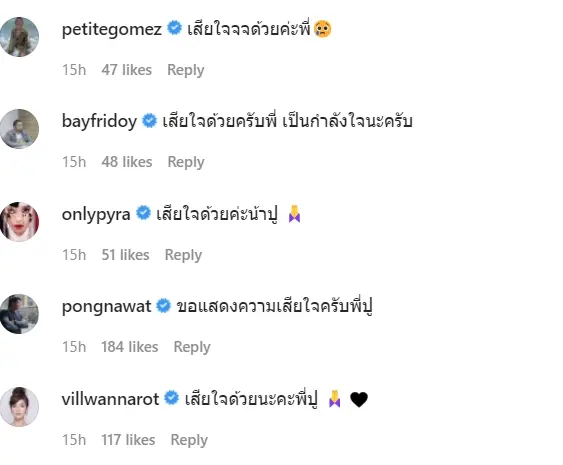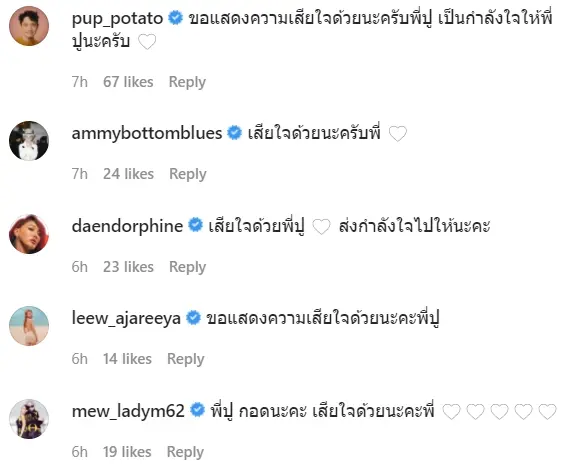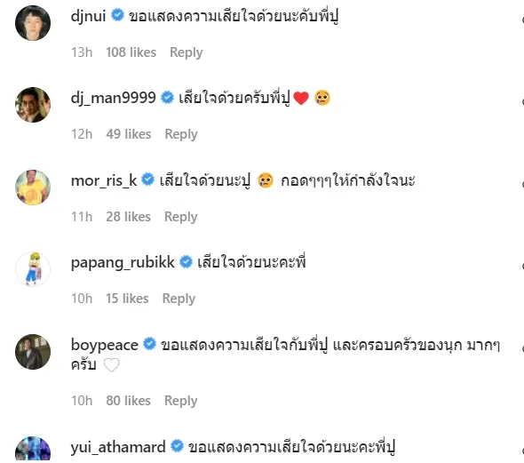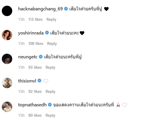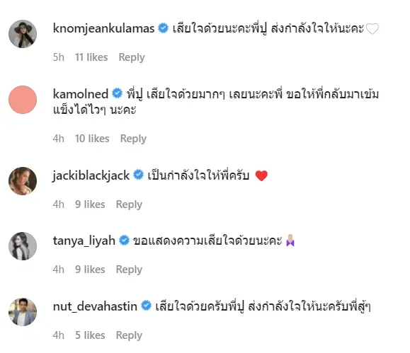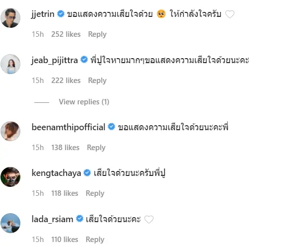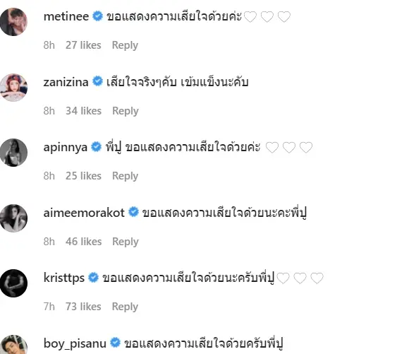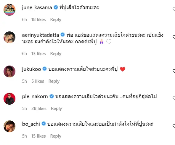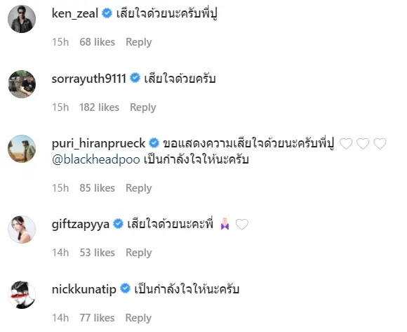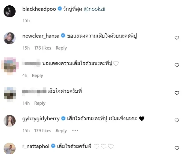 ซึ่งในโพสต์ดังกล่าวนั้นก็ได้มีเหล่าบรรดาคนบันเทิงต่างเข้ามาคอมเมนต์กันอย่างเนืองแน่น พร้อมร่วมแสดงความไว้อาลัย ถึง นุ๊กซี่ และให้กำลังใจกับ ปู แบล็คเฮด กันอย่างไม่ขาดสายเลยก็ว่าได้ ไม่ว่าจะเป็น นิวเคลียร์ หรรษา ,กิ๊บซี่ วนิดา ,เจ เจตริน ,บี น้ำทิพย์ ,หนึ่ง อีทีซี ,ป้อง ณวัฒน์ ,สรยุทธ สุทัศนะจินดา ,ดีเจนุ้ย ,ลูกเกด เมทินี ,บอย พิษณุ และท่านอื่นอีกนับหลายชีวิต