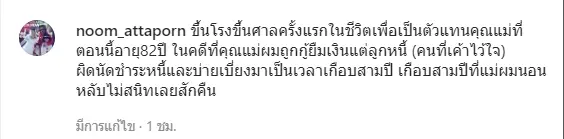 โดย หนุ่ม อถรรพร ได้โพสต์รูปภาพบริเวณหน้าศาลแพ่ง พร้อมกับระบุข้อความว่า “ขึ้นโรงขึ้นศาลครั้งแรกในชีวิตเพื่อเป็นตัวแทนคุณแม่ที่ตอนนี้อายุ82ปี ในคดีที่คุณแม่ผมถูกกู้ยืมเงินแต่ลูกหนี้ (คนที่เค้าไว้ใจ) ผิดนัดชำระหนี้และบ่ายเบี่ยงมาเป็นเวลาเกือบสามปี เกือบสามปีที่แม่ผมนอนหลับไม่สนิทเลยสักคืน“