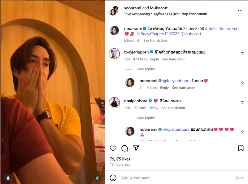 ล่าสุด นุ่น รมิดา ได้โพสต์ภาพและคลิปสุดประทับใจผ่านอินสตาแกรม เผยให้เห็นวินาทีที่พ่อลูกได้เจอกันครั้งแรก สีหน้าและอารมณ์ของ หลุยส์ สก็อต ชัดเจนว่าเต็มไปด้วยความตื้นตันและดีใจถึงขั้นน้ำตาซึม พร้อมแคปชั่นสุดซึ้ง “วินาทีพ่อลูกได้เจอกัน 22june2568 #thefirsttimewemet #LRnewChapter129202 @louisscott”