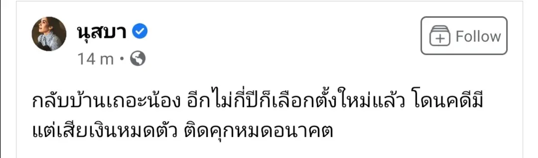 โดยนุสบา ได้ออกมาโพสต์ข้อความและระบุว่า “กลับบ้านเถอะค่ะน้องๆ กอดๆๆๆ อีกไม่กี่ปีก็เลือกตั้งใหม่แล้ว โดนคดีมีแต่เสียเงินหมดตัว ติดคุกหมดอนาคต”