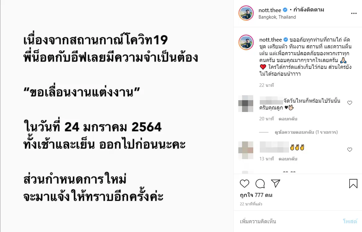 ‘ขออภัยทุกท่านที่ถามไถ่ ตัดชุด เตรียมตัว ทีมงาน สถานที่ และความตื่นเต้น แต่เพื่อความปลอดภัยของพวกเราทุกคนครับ ขอบคุณมากๆจากใจเลยครับ ??❤️ ใครได้การ์ดแล้วเก็บไว้ก่อน ส่วนใครยังไม่ได้รอก่อนน้าาาา’