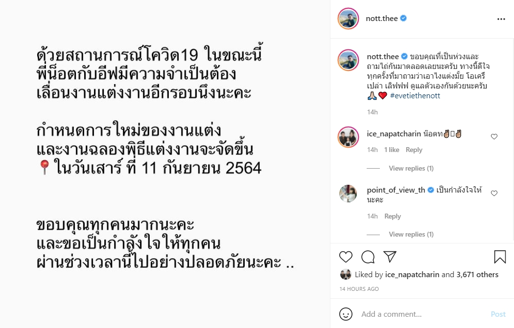 “ด้วยสถานการณ์โควิด-19 ในขณะนี้ พี่น็อตกับอีฟมีความจำเป็นต้องเลื่อนงานแต่งงานอีกรอบนึงนะคะ
