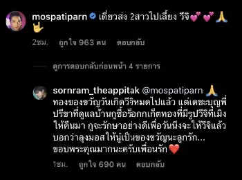 ล่าสุด หนุ่ม ศรราม ก็ได้เข้าคอมเมนต์ขอบคุณ พร้อมจัดชุดใหญ่ให้อีกชุดว่า “@mospatiparn ทองของขวัญวันเกิดวีจิหมดไปแล้ว แต่เดชะบุญที่พี่ปรีชาที่ดูแลบ้านซื้อร็อกเก็ตทองที่มีรูปวีจิที่ให้คืนมา **จะรักษาอย่างดีเพื่อวันหนึ่งจะให้วีจิ แล้วบอกว่าลุงมอสให้หนูเป็นของขวัญนะลูกรัก… ขอบพระคุณมากนะครับเพื่อนรัก”