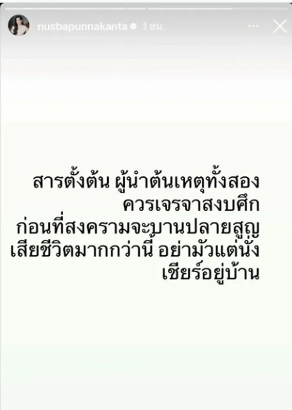 นุสบา เดือด! โพสต์สตอรี่เรียกร้องผู้นำไทย-กัมพูชาเจรจาสงบศึก หลังเหตุปะทะชายแดน