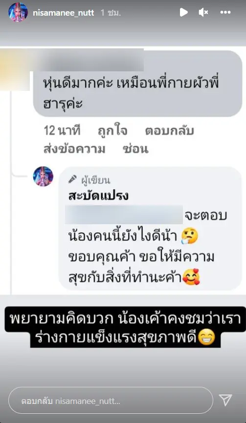 แต่ล่าสุดสาวนัทก็ได้อัปเดตไอจีสตอรี่หลังมีผู้ใช้งานโซเชียลเข้ามาคอมเมนต์บางอย่างจนเจ้าตัวถึงกับเกิดคำถาม โดยความคิดเห็นดังกล่าวระบุว่า ‘หุ่นดีมากค่ะ เหมือนพี่กายผัวพี่ฮารุ’ จากนั้นสาวนัทจึงได้ตอบกลับแบบปัง ๆ ว่า ‘จะตอบน้องคนนี้ยังไงดีน้า ขอบคุณค้า ขอให้มีความสุขกับสิ่งที่ทำนะค้า’ ก่อนจะแคปรูปภาพดังกล่าวลงในไอจีสตอรี่พร้อมเขียนแคปชั่นอีกครั้ง ‘พยายามคิดบวก น้องเค้าคงชมว่าเราร่างกายแข็งแรงสุขภาพดี’