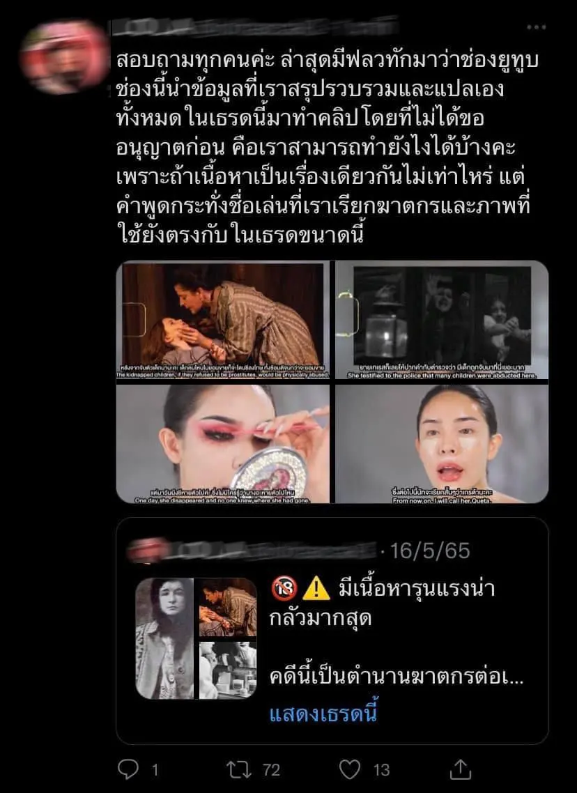 ซึ่งเจ้าของแอคเคาท์ดังกล่าวได้เล่าว่า “สอบถามนะคะ ล่าสุดมีฟลวทักมาว่าช่องยูทูบช่องนี้นำข้อมูลที่เราสรุปรวบรวมและแปลเองทั้งหมดในเธรดนี้มาทำคลิปโดยที่ไม่ได้ขออนุญาตก่อน คือเราสามารถทำยังไงได้บ้างคะ เพราะถ้าเนื้อหาเป็นเรื่องเดียวกันไม่เท่าไหร่ แต่คำพูดแม้กระทั่งชื่อเล่นที่เราเรียกฆาตกรและภาพที่ใช้ยังตรงกับในเธรดขนาดนี้”