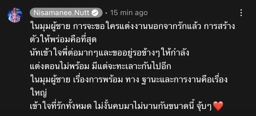 ในมุมผู้ชาย การจะขอใครแต่งงาน นอกจากรักแล้ว การสร้างตัวให้พร้อมคือที่สุด นัทเข้าใจพี่ต่อมาก ๆ และขออยู่รอข้าง ๆ ให้กำลังใจ แต่งตอนไม่พร้อม มีแต่จะทะเลาะกันไปอีก ในมุมผู้ชาย เรื่องการพร้อม ทางฐานะและการงานคือเรื่องเข้าใจที่รักทั้งหมด ไม่งั้นคบมาไม่นานกันขนาดนี้ จุ้บ ๆ