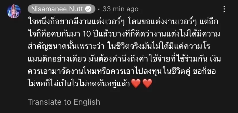 ใจหนึ่งก็อยากมีงานแต่งเวอร์ ๆ โดนขอแต่งงานเวอร์ ๆ แต่อีกใจก็คือคบกันมา 10 ปีแล้ว บางทีก็คิดว่างานแต่งไม่ได้มีความสำคัญขนาดนั้นเพราะว่า ในชีวิตจริงมันไม่ได้มีแค่ความโรแมนติกอย่างเดียว มันต้องคำนึงถึงค่าใช้จ่ายที่ใช้ร่วมกัน เงินควรเอามาจัดงานไหมหรือควรเอาไปลงทุนในชีวิตคู่ ขอก็ขอ ไม่ขอก็ไม่เป็นไรไม่กดดันอยู่แล้ว