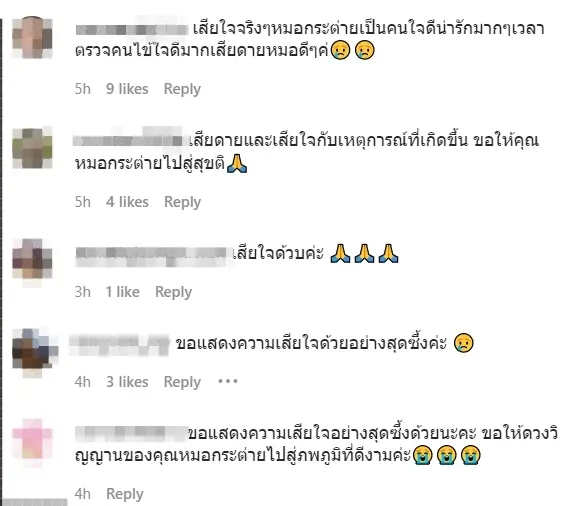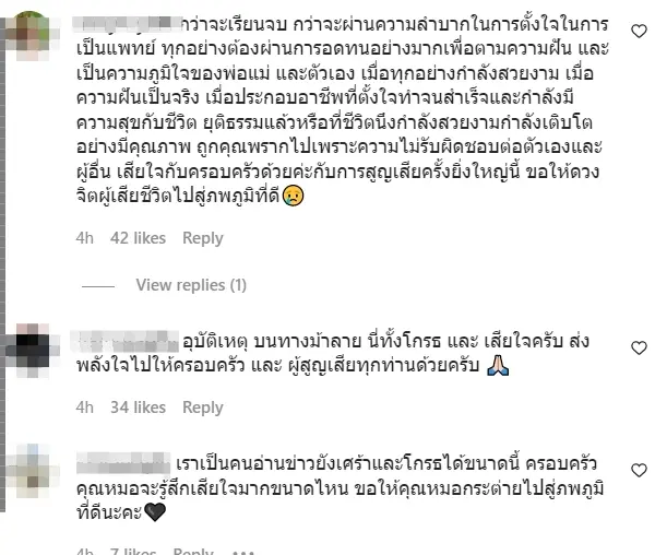 ขอแสดงความเสียใจกับครอบครัว คุณหมอกระต่ายอย่างสุดซึ้งนะครับ น้องเป็นที่รักของเพื่อนๆ พี่ๆ ทุกท่านที่รพ. ด้วยความสามารถ ความน่ารัก ความตั้งใจเพื่อคนไข้อย่างสูงสุดเสมอมา เป็นที่น่าเสียดายต่อวงการแพทย์ของเราที่สูญเสียจักษุแพทย์ผู้เชี่ยวชาญไปก่อนเวลา อันควร และขอวิงวอนให้เหตุการณ์นี้เป็นอีกครั้งที่อยากจะย้ำเตือนถึงผู้ขับขี่ใช้รถใช้ถนนทุกท่านในเรื่องความเร็ว และความประมาท เพราะความสูญเสียอาจส่งผลต่อผู้อื่นและสังคมอย่างประเมินค่าไม่ได้นะครับ #mayhersoulrestinpeace