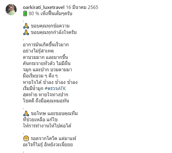 แต่หลังจากที่ถึงมือของคุณหมอแล้ว ล่าสุด(16 มี.ค. 65) เอ๊าะ ก็ได้มีการออกมาอัปเดตอาการทั้งหมดผ่านทางไอจีของตัวเองแล้วว่า เป็นอาการแพ้ที่ยังไม่รู้สาเหตุที่แน่ชัด แต่ได้มีการตรวจ ATK แล้ว ไม่พบเชื้อโควิด-19 พร้อมทั้งขอโทษและขอบคุณทีมงานทุกคนที่ให้ความช่วยเหลือ งานนี้ก็มีคนเข้าไปให้กำลังใจทั้งทางด้านของ แจ๊ส ชวนชื่น , ฟลุ๊ค จิระ อวยพรขอให้เจ้าตัวหายเร็ว ๆ